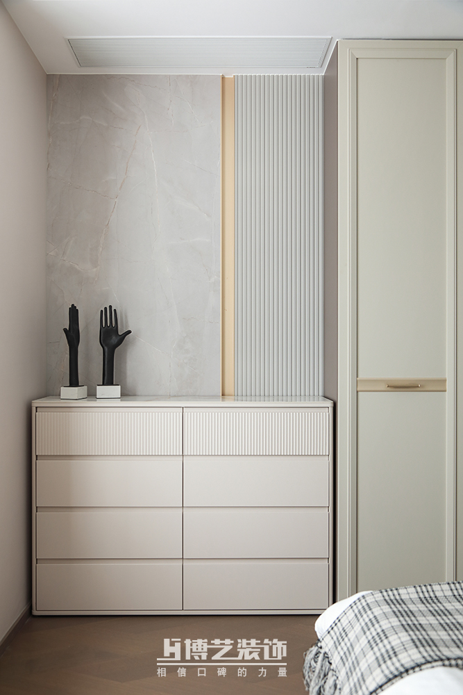 全屋以溫柔細膩的奶油白呈現(xiàn),在造型上做減法,在視覺上做加法,極簡的手法,加上軟裝的點綴,讓家更有溫馨的生活氣息。