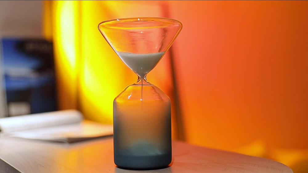 深灰的墻面,透光的玻璃磚再打上一盞落日燈,將臥室的情調拉滿,安靜的空間中,浪漫與溫柔隨感官擴大。