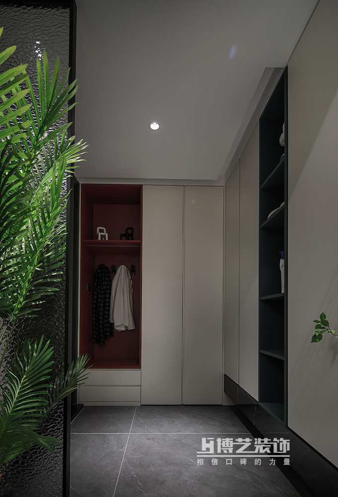 進門一組“L”型收納柜,低飽和的色彩組合融洽又溫暖。轉彎的玻璃隔斷平添幾分精致與時尚。