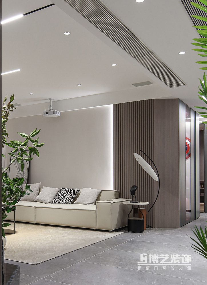 柜子與木飾面的雙拼把墻與門做了很好的隱藏,白色與暖咖色的組合與沙發(fā)背景形成呼應,整個空間至簡至美,營造高級又溫暖。
