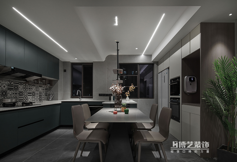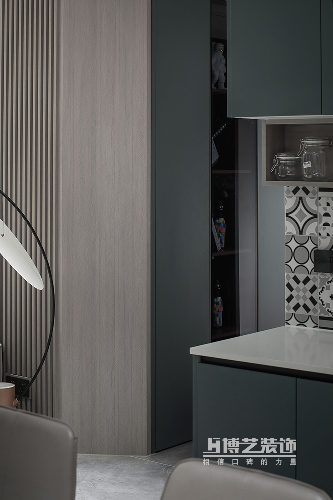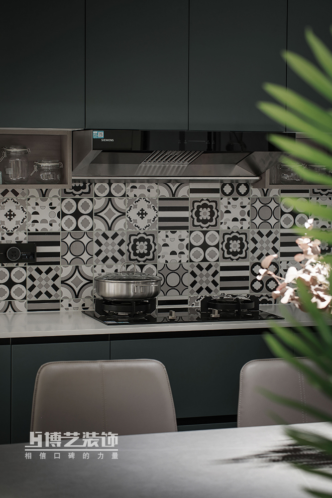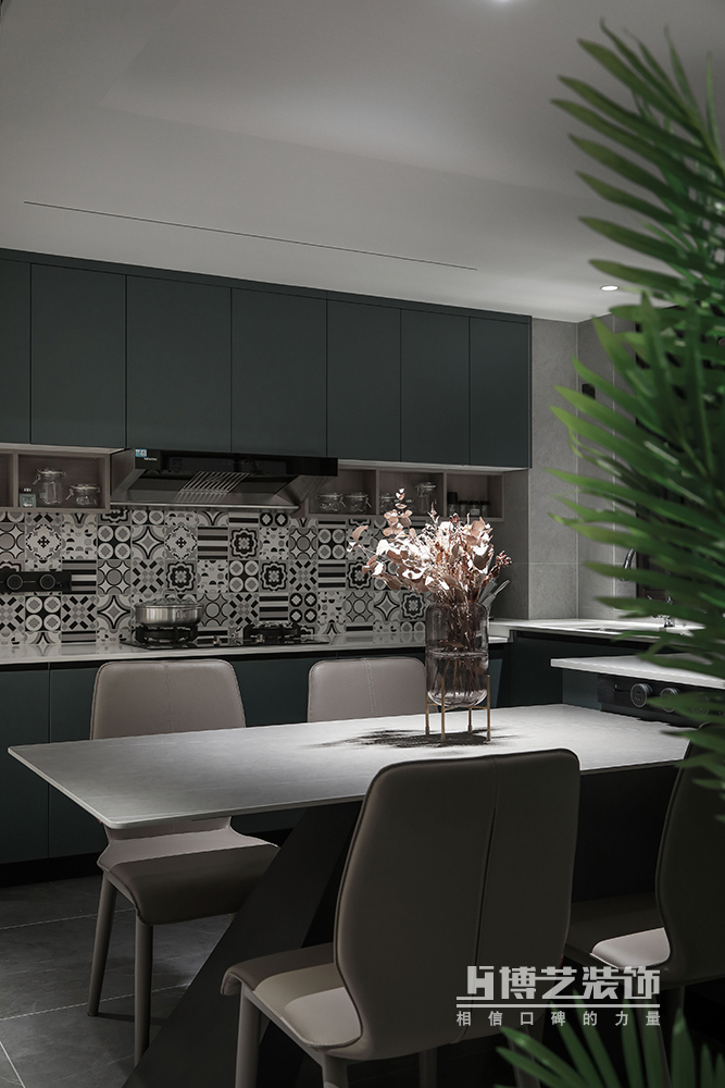 餐廚一體的設計讓空間更加寬敞,墨綠的柜體與拼花的墻面成為家中不可忽視的亮點,美好的用餐環(huán)境讓菜肴也變得更美味了。