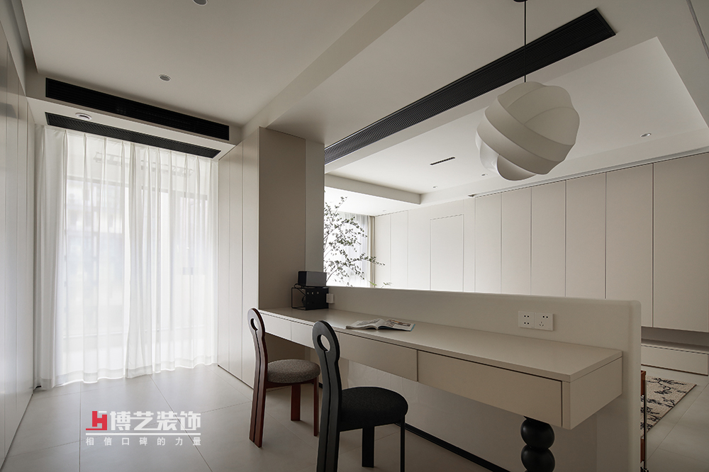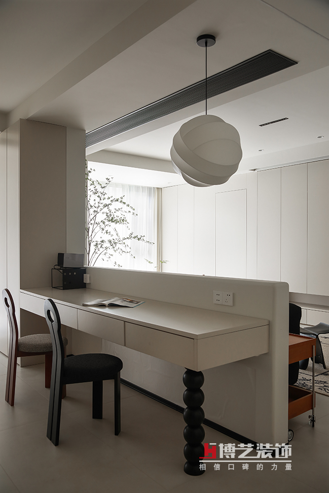 在客廳背面,與之緊緊相連的是一個(gè)開放式書房,區(qū)別于傳統(tǒng)密閉空間的書房,我們將書房進(jìn)行了空間上的外放。不論是居家辦公,還是閑時(shí)閱讀創(chuàng)作,既能有一方專屬的天地,又讓自己不閉塞于物理空間中,創(chuàng)作思緒也隨之自由揮發(fā)。桌子、柜子的半隔斷設(shè)計(jì),不僅區(qū)分了兩個(gè)空間,還兼具家居存儲(chǔ)收納作用。