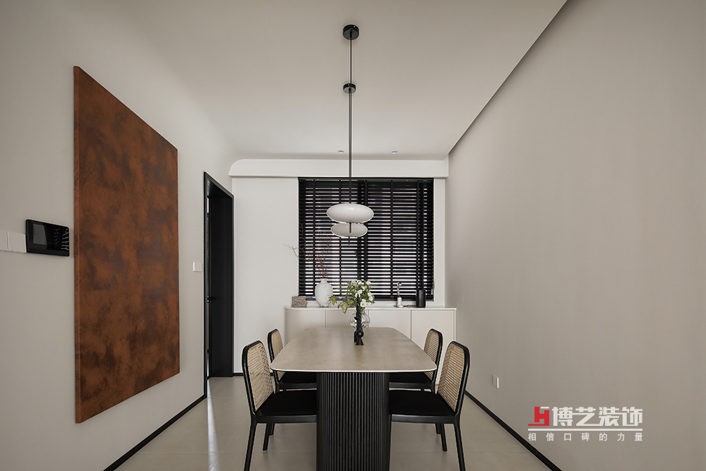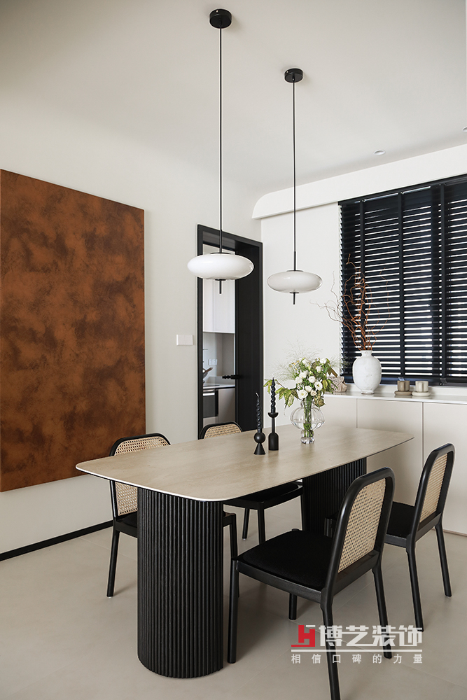 兩盞圓形吊燈,一張方形餐桌,自古“天圓地方”的設(shè)計(jì)理念在餐廳得到了很好的展現(xiàn)。黃褐色的大幅裝飾畫,又給餐廳黑白空間中注入了一劑更堅(jiān)定柔和的力量,讓餐廳空間的色彩不至于單調(diào)。