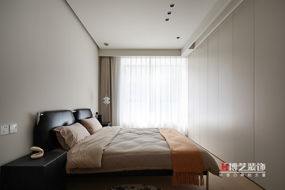 主臥將簡(jiǎn)約風(fēng)做到了極致,整墻的按壓式儲(chǔ)物柜,不同于拉手式衣櫥,讓柜體更隱形,視覺(jué)上增加空間感。簡(jiǎn)易的撞色桌椅,在恬靜的空間中雜糅一抹動(dòng)感紅棕,讓整個(gè)臥室環(huán)境更具層次。